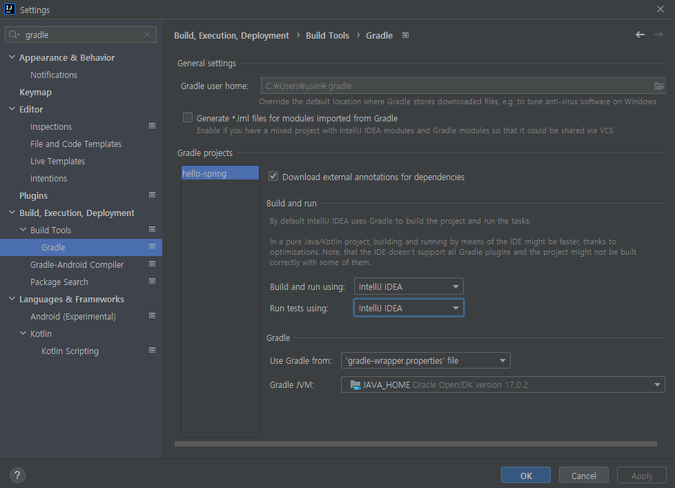 • 현재 IntelliJ는 Gradle을 통해서 실행하는 것이 기본설정인데, 이는 실행속도가 느리다. 그래서 자바로 바로 실행 할 수 있도록 설정을 변경해주는 것이 좋다!