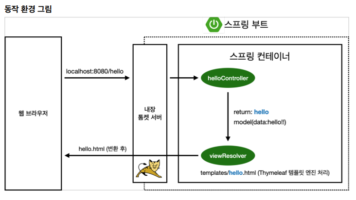 • Controller에서 리턴값으로 반환된 문자 hello는 좀 뜬금없게 느껴지는데 이는 스프링에서 src/main/resourcestemplates에서 hello라는 이름의 View를 찾아서 반환해준다는 뜻이다.