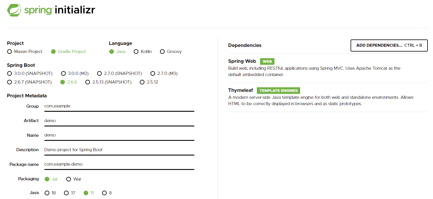 Thymeleafhtml을 만들어주는 템플릿 엔진이다. 프로젝트 마다 여러 종류를 사용할 수 있지만 여기서는 Thymeleaf를 쓰겠다. Spring Boot 버전은 업그레이드 됨에 따라 변경될 수 있다. SNAPSHOT이나 M1 같은 미정식 버전을 제외하고 사용하면 된다.