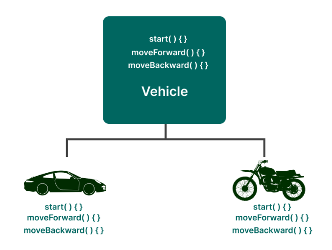 위의 예시를 보면 자동차와 오토바이는 모두 이동수단이고, 이동수단은 출발, 전진과 후진을 할 수 있다는 공통점을 가진다. 이를 객체지향적 사고를 통해 표현하면 자동차와 오토바이라는 하위클래스들의 공통적인 메소드를 추출하여 이동수단이라는 상위클래스에 정의한 것이다.