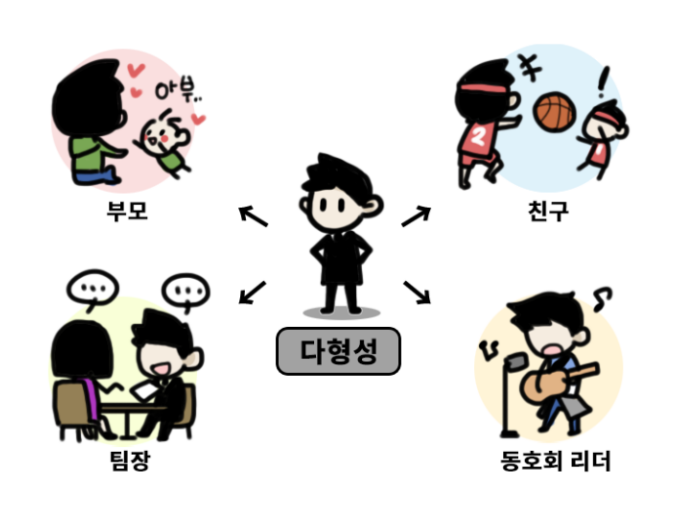 비유적으로 표현하면 어떤 중년의 남성이 있다고 했을 때 그 남자의 역할이 아내에게는 남편, 자식에게는 아버지, 부모님에게는 자식, 회사에서는 회사원, 동아리에서는 리더 등 상황과 환경에 따라서 달라지는 것과 비슷하다.