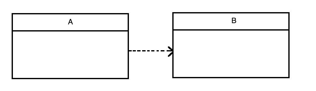 그렇다면 ‘의존한다’ 라는게 정확히 무슨 의미일까? 여기서는 B가 변하면 그것이 A에 영향을 미친다는 뜻이다. B의 기능이 추가되거나 변경되거나, 형식이 바뀌거나 하면 그 영향이 A로 전달 된다는 것이다. 대표적으로 A가 B에 정의된 메소드를 호출해서 사용하는 경우, 사용에 대한 의존관계에 있다고 표현한다.
