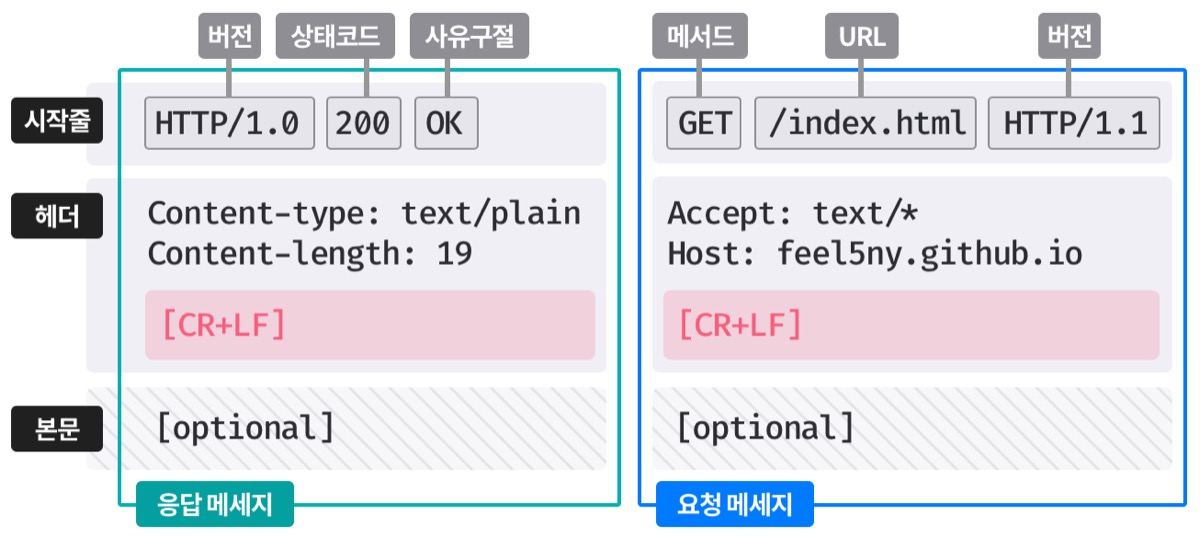 HTTP 메시지는 서버와 클라이언트 간에 데이터가 교환되는 방식입니다. 메시지 타입은 두 가지가 있습니다. 요청(request) 은 클라이언트가 서버로 전달해서 서버의 액션이 일어나게끔 하는 메시지고, 응답(response) 은 요청에 대한 서버의 답변입니다.