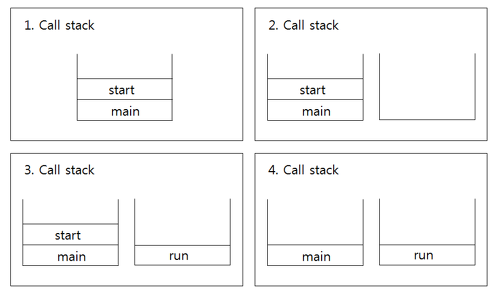 모든 쓰레드는 독립적인 작업을 수행하기 위해 자신만의 호출스택을 필요로 하는데, start() 를 통해 작업을 수행할때마다 새로운 호출스택을 생성하고 쓰레드가 종료되면 생성된 호출스택을 소멸되게 하여 쓰레드의 실행이 가능하게끔 한다.