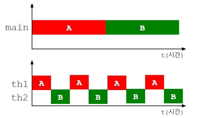 위 그림은 싱글코어 환경에서 싱글 쓰레드와 멀티쓰레드의 작업을 비교한 그림이다. 첫번째 그림은 싱글쓰레드에서 두개의 작업을 처리하는 경우이다. A작업을 마친후에 B작업을 수행하는것을 볼 수 있다. 두번째 그림은 멀티쓰레드(2개)로 두개의 작업을 처리하는 경우이다. 두개의 쓰레드로 작업 하는 경우에는 짧은 시간동안 th1, th2 두개의 쓰레드가 번갈아가며 작업하고 있기때문에 두 작업이 동시에 처리되는 것처럼 느끼게 한다.