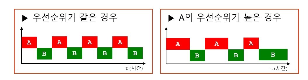 위의 그림은 WINDOWS의 싱글코어 환경에서 쓰레드의 우선순위가 같은 경우와 A가 더 높은 경우 두가지 실행시간에 대한 그림이다. 우선순위가 같은 경우 A,B 두개의 쓰레드가 거의 동일한 실행시간을 가지지만, A의 우선수위가 높은 경우에는 A에 더 많은 실행시간이 먼저 부여된것을 볼 수 있다. 때문에 A가 먼저 작업이 끝나고 B가 이후에 끝나는 모습이 보인다.