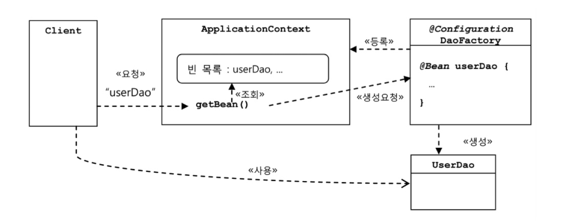 위의 코드는 @Bean으로 생성된 userDao 스프링빈을 UserDaoTest 에서 가져와 사용하는 코드이다. UserDaoTestUserDao의 설정정보를 사용하는 애플리케이션 콘텍스트로 작동하는 것이다.