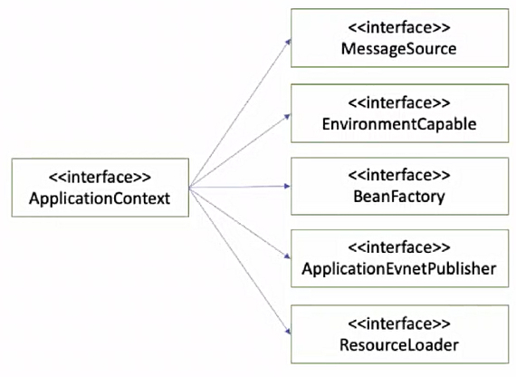 앞서 스프링 컨테이너는 ApplicationContext와 BeanFactory로 이루어졌다고 언급했는데, 사실 ApplicationContext는 BeanFactory를 상속하고 있는 구조를 띈다. 뿐만 아니라 여러 인터페이스를 다중상속 하고 있는데 각 기능을 살펴보면 다음과 같다.